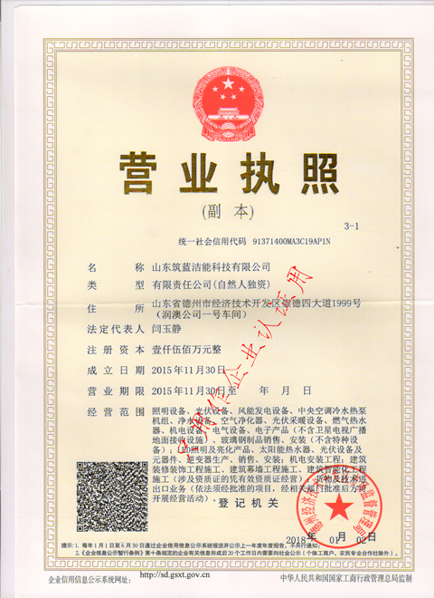 山東筑藍(lán)潔能科技有限公司創(chuàng)建于2015年,擁有建筑業(yè)企業(yè)資質(zhì)證書--城市及道路照明工程專業(yè)承包叁級,是一家集設(shè)計(jì)、生產(chǎn)制造、安裝服務(wù)于一體的新能源企業(yè),專業(yè)從事太陽能路燈、LED路燈、高桿燈、庭院燈、景觀燈、中華燈、草坪燈、光伏設(shè)備、風(fēng)能發(fā)電設(shè)備的生產(chǎn)及銷售、安裝及售后服務(wù);同時(shí)還從事凈水設(shè)備、空氣凈化器、光伏采暖設(shè)備、燃?xì)鉄崴鳌C(jī)電設(shè)備、玻璃鋼制品的銷售、安裝,LED照明及亮化產(chǎn)品、太陽能熱水器、光伏設(shè)備及元器件生產(chǎn)、銷售、安裝;建筑裝飾裝修工程施工、兼建筑幕墻工程施工、建筑智能化工程施工等產(chǎn)品專業(yè)生產(chǎn)加工的公司,擁有完整、科學(xué)的質(zhì)量管理體系。