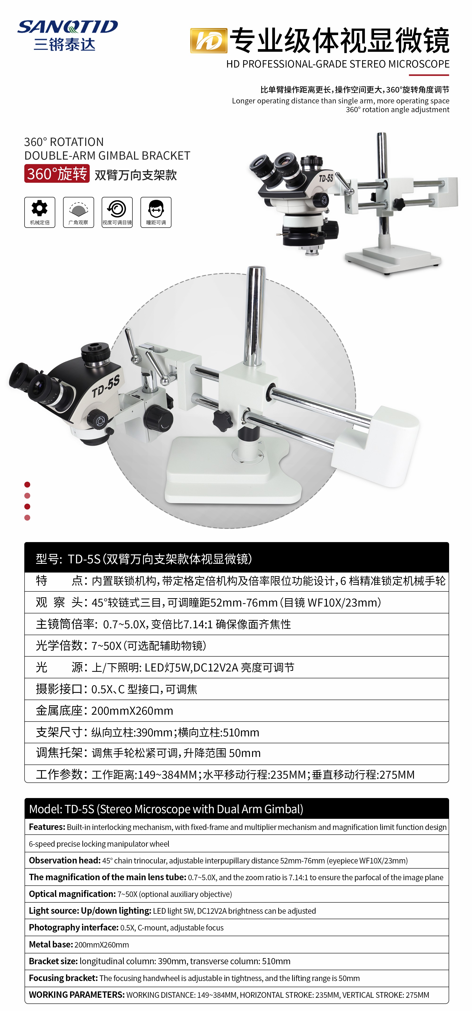 三鏘泰達-5S雙臂體視顯微鏡,比單臂操作距離更遠,操作空間更大 360° 旋轉角度調(diào)節(jié)。