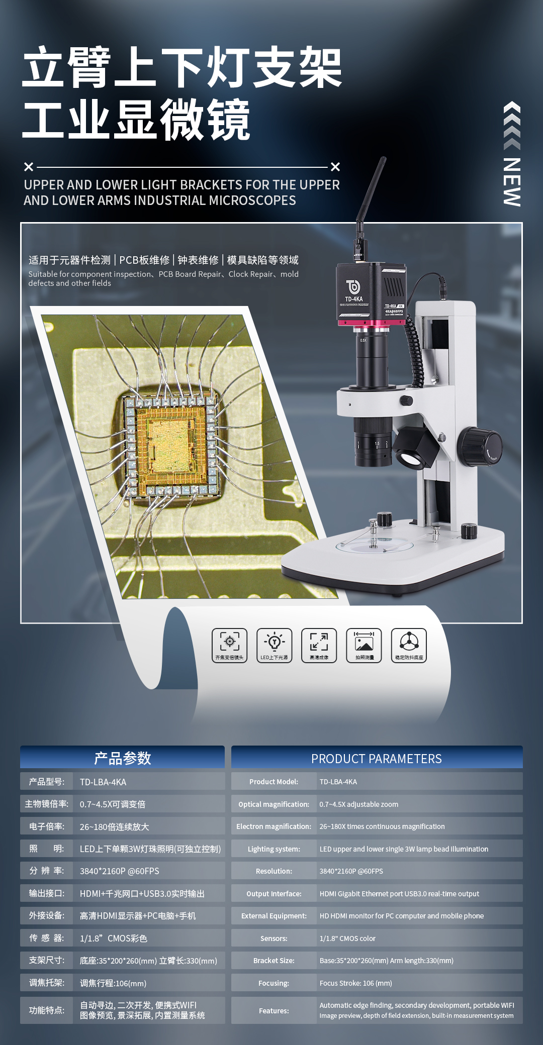 三鏘泰達 立臂上下燈4K多功能可WIFI傳輸工業顯微鏡TD-LBA-4KA,上下光源可獨立調節,支架支持選配
