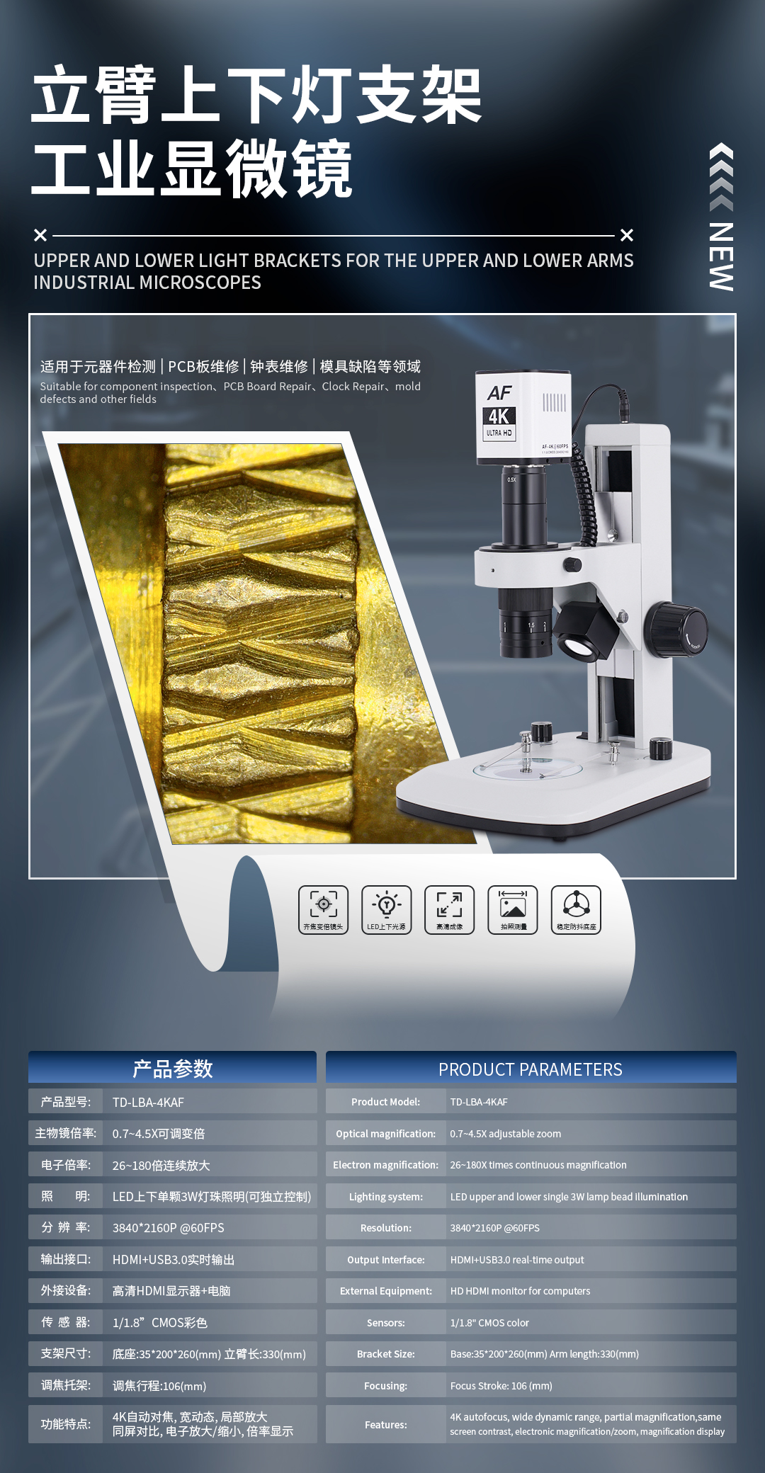 三鏘泰達 立臂上下燈4K自動對焦工業顯微鏡TD-LBA-4KAF,上下光源可獨立調節,支架支持選配