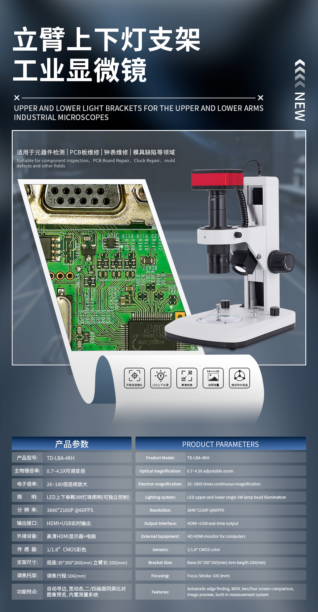 三鏘泰達 立臂上下燈4K高清雙輸出工業顯微鏡TD-LBA-4KH,上下光源可獨立調節,支架支持選配