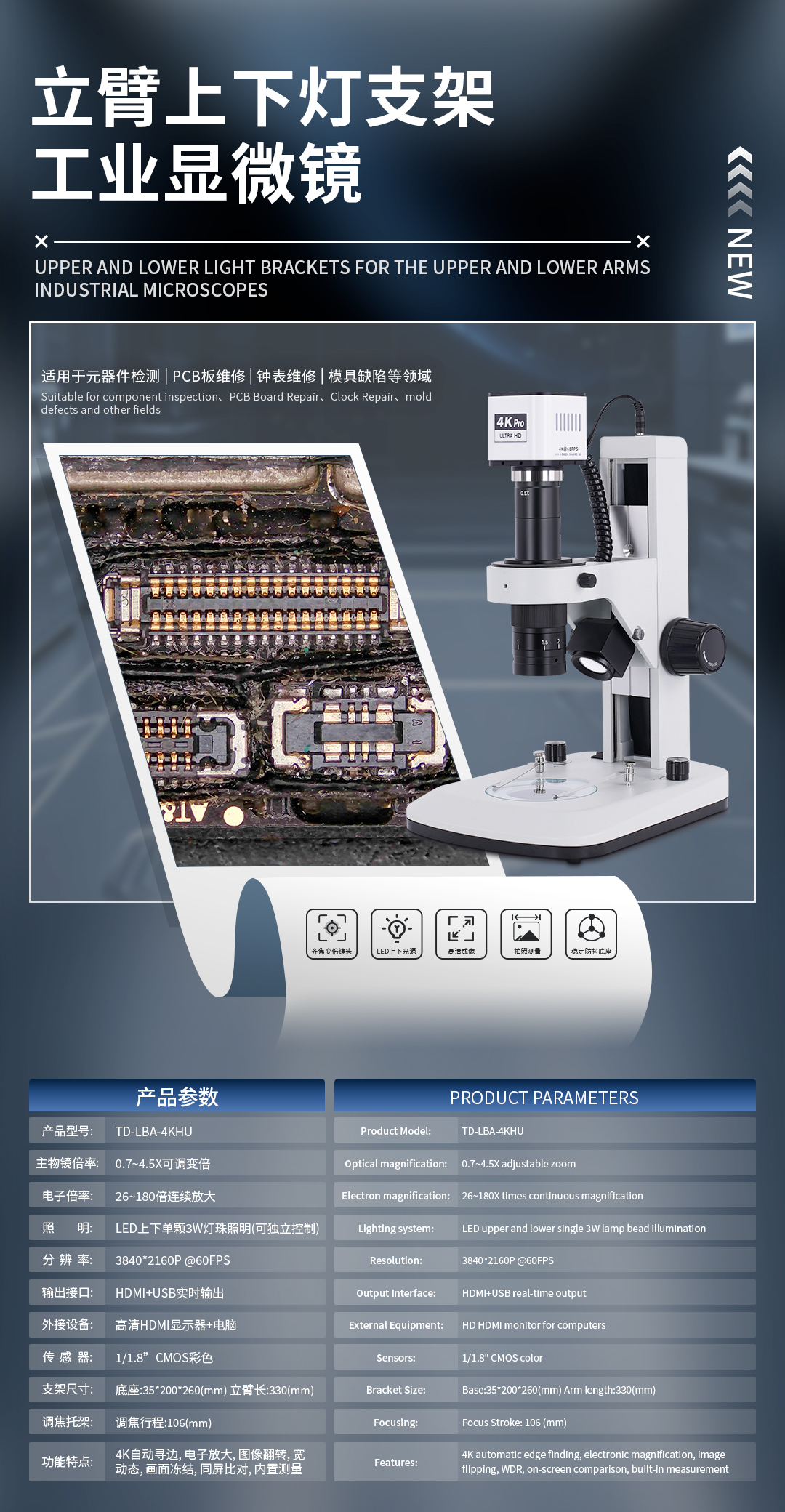 三鏘泰達 立臂上下燈4K自動尋邊工業顯微鏡TD-LBA-4KHU,上下光源可獨立調節,支架支持選配