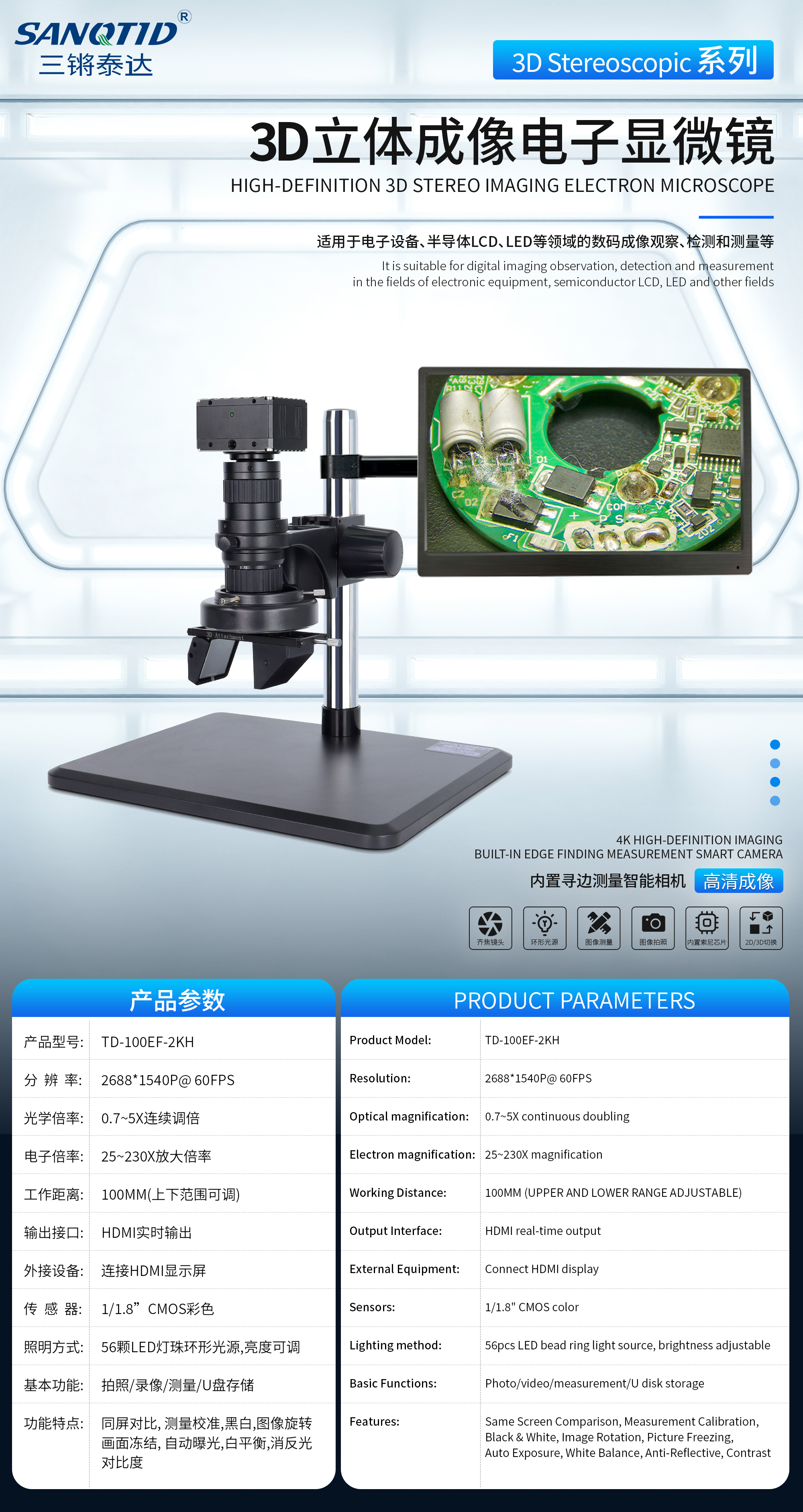 三鏘泰達-2K高清輸出3D立體顯微鏡TD-100EF-2KH,可手動切換2D/3D觀察角度 ,采用3D鏡頭觀測立體元件和深孔,切換時清晰度保持不變,中心位置一致,提供360度旋轉觀察。