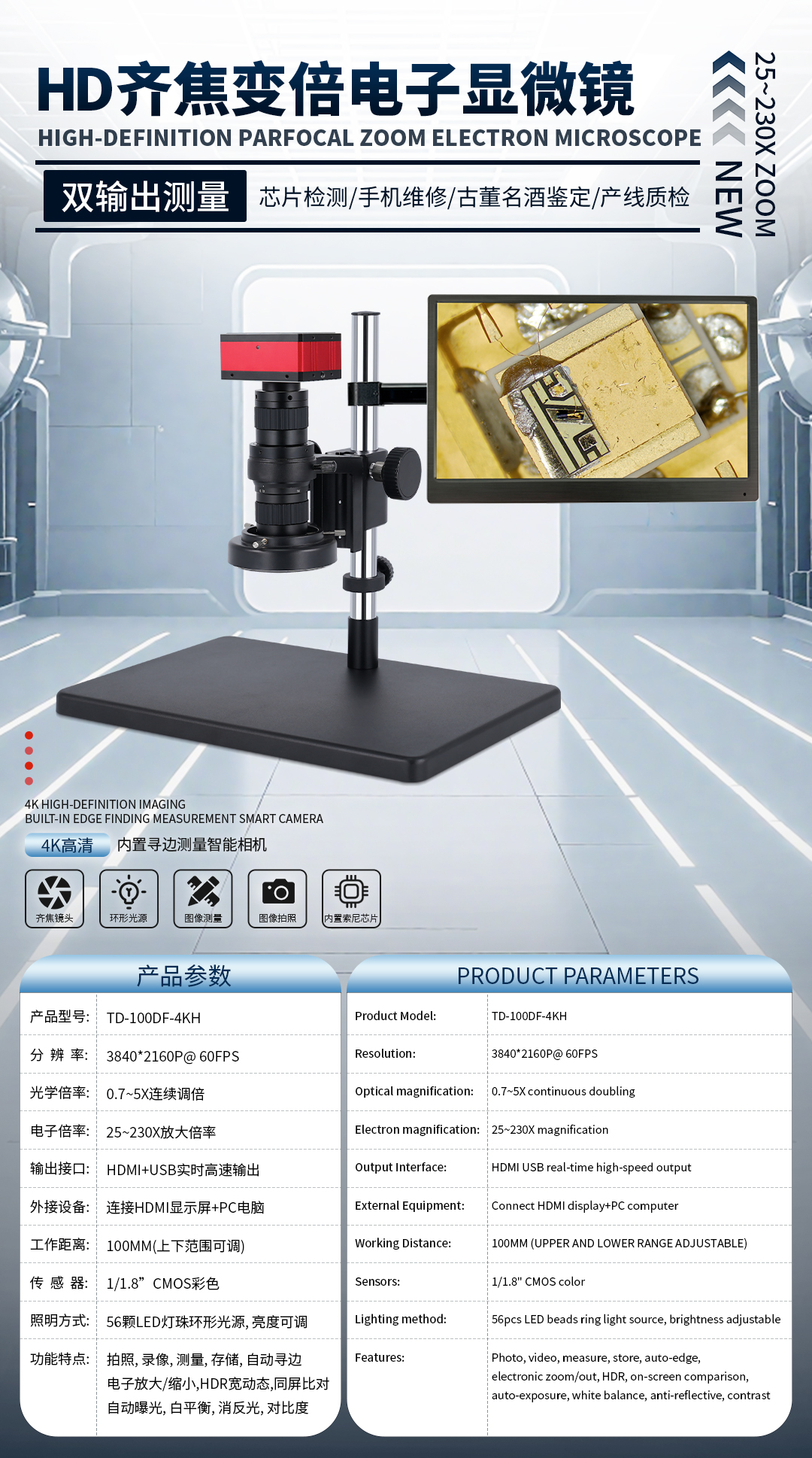 三鏘泰達-4K自動尋邊齊焦視頻顯微鏡TD-100DF-4KH,0.7-5.0X齊焦倍率調(diào)節(jié),高清晰精度,優(yōu)質(zhì)光學系統(tǒng)確保像面齊焦性,適合芯片檢測/手機維修/古董名酒鑒定/產(chǎn)線質(zhì)檢等。