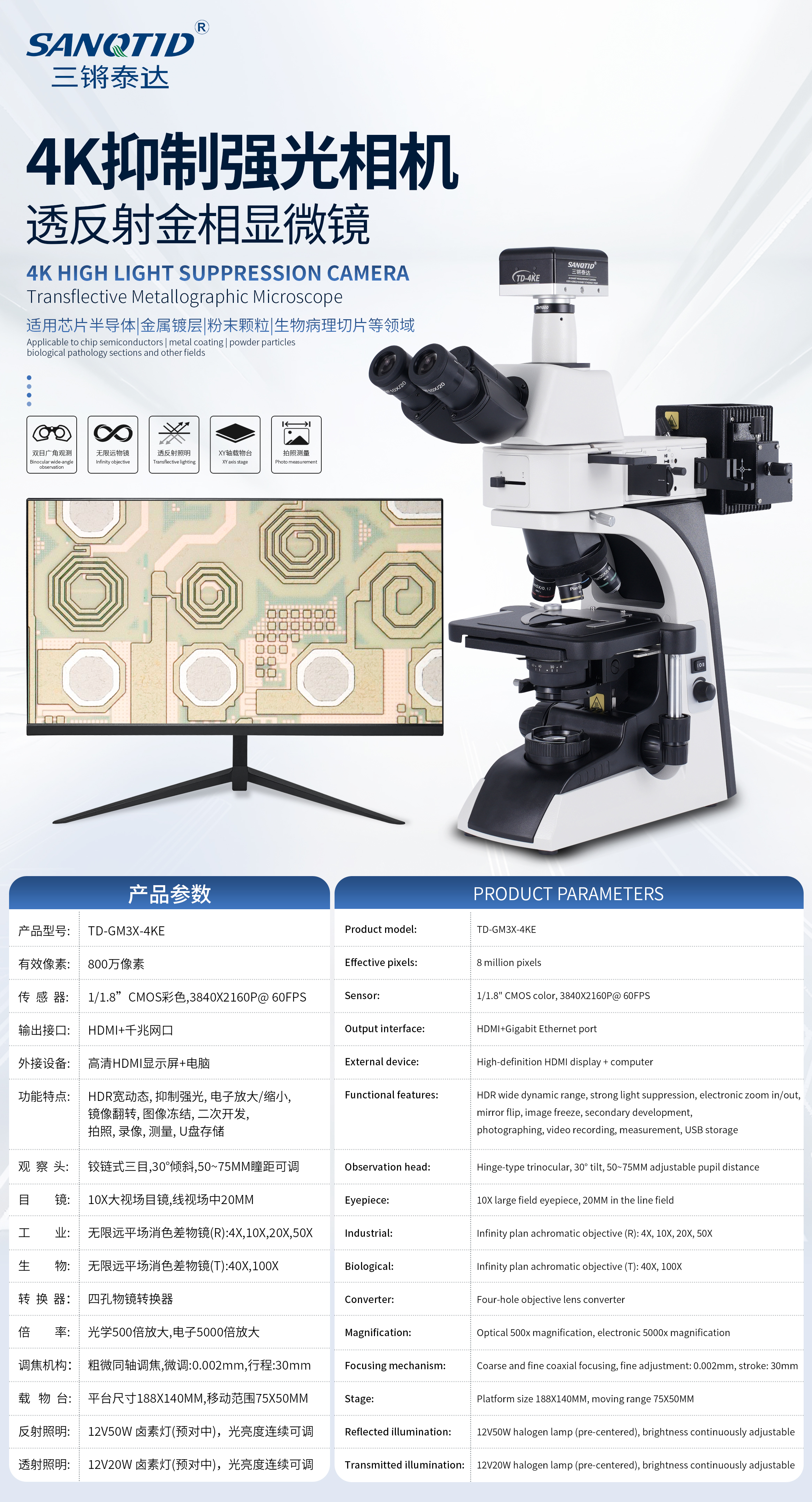三鏘泰達-4K高清抑強光透反射金相顯微鏡TD-GM3X-4KE