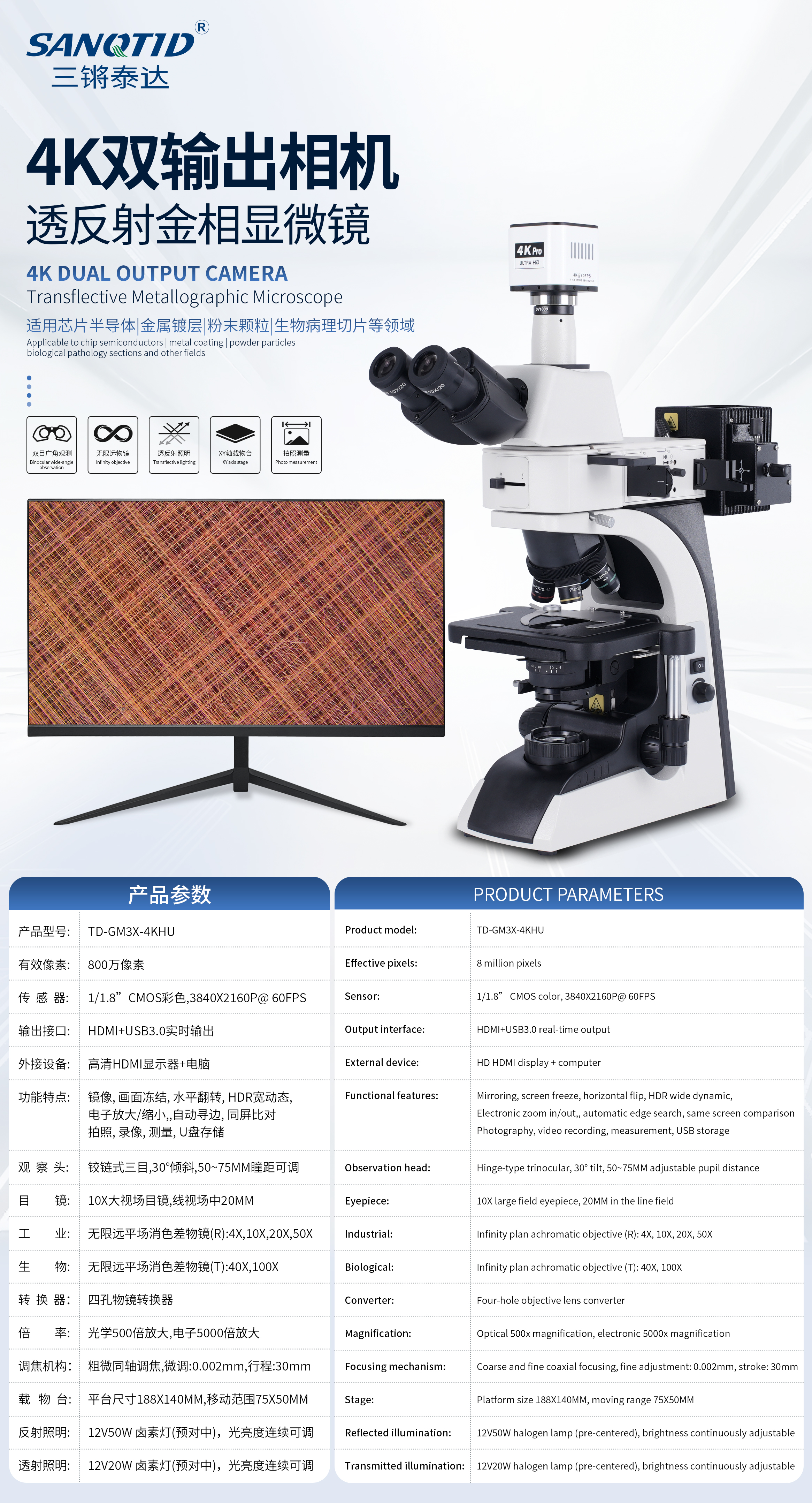 三鏘泰達-4K雙輸出傳輸透反射金相顯微鏡TD-GM3X-4KHU