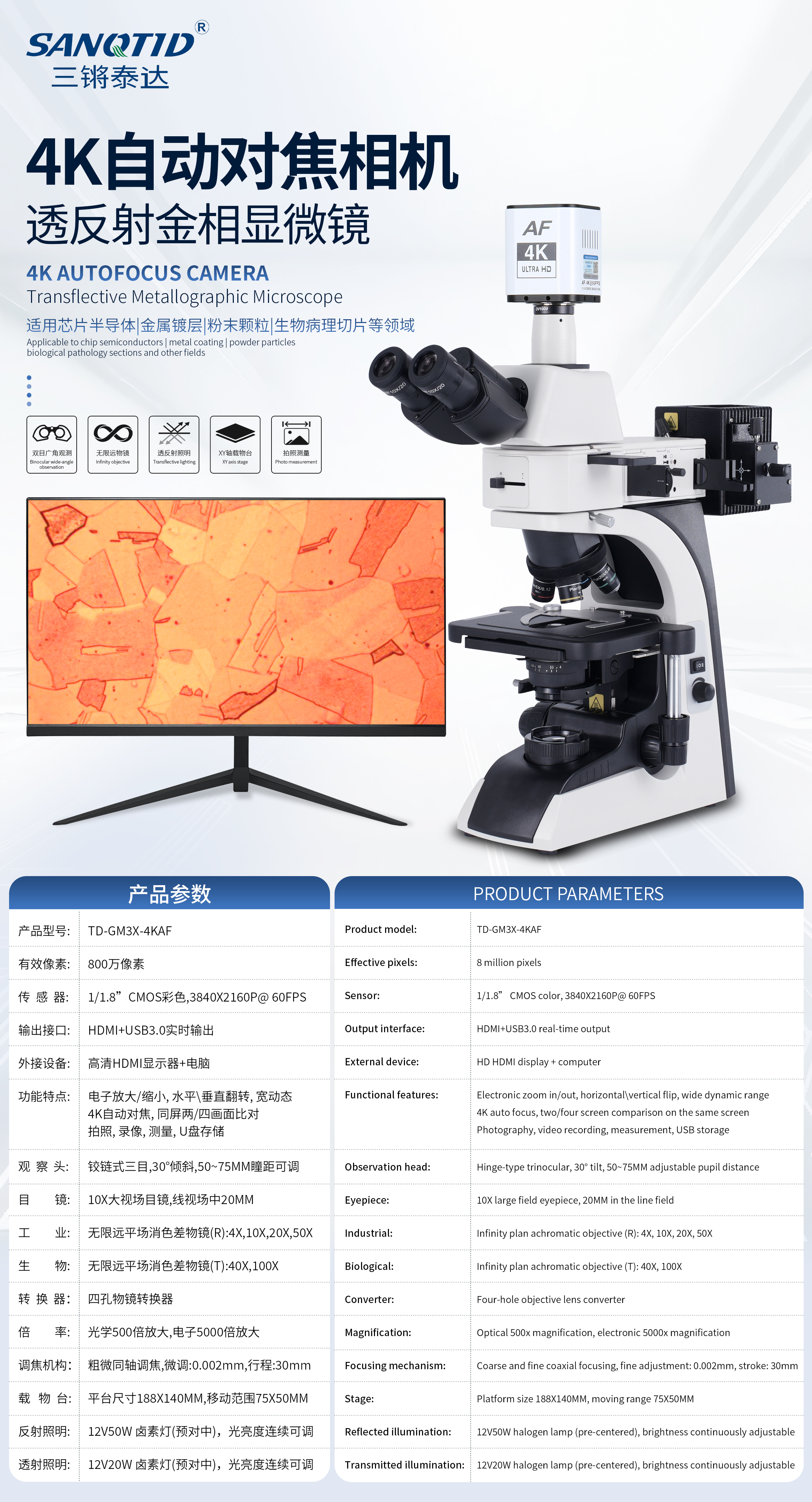 三鏘泰達-4K自動對焦傳輸透反射金相顯微鏡TD-GM3X-4KAF