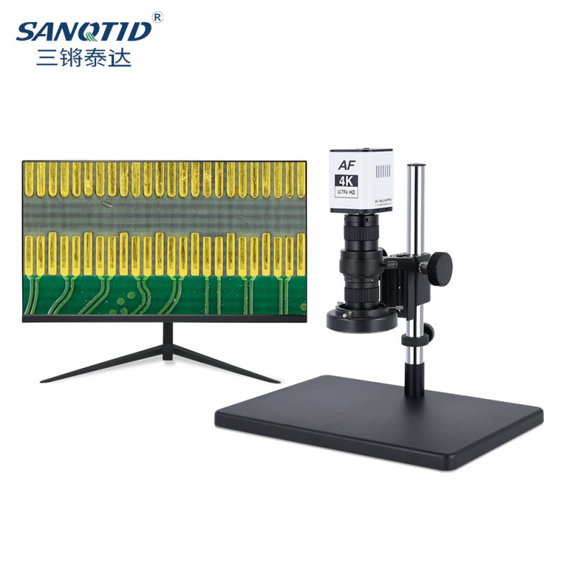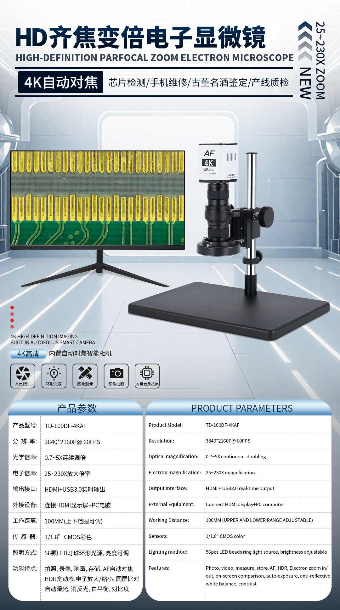 三鏘泰達-4K自動對焦齊焦視頻顯微鏡TD-100DF-4KAF,0.7-5.0X齊焦倍率調節,高清晰精度,優質光學系統確保像面齊焦性,適合芯片檢測/手機維修/古董名酒鑒定/產線質檢等。