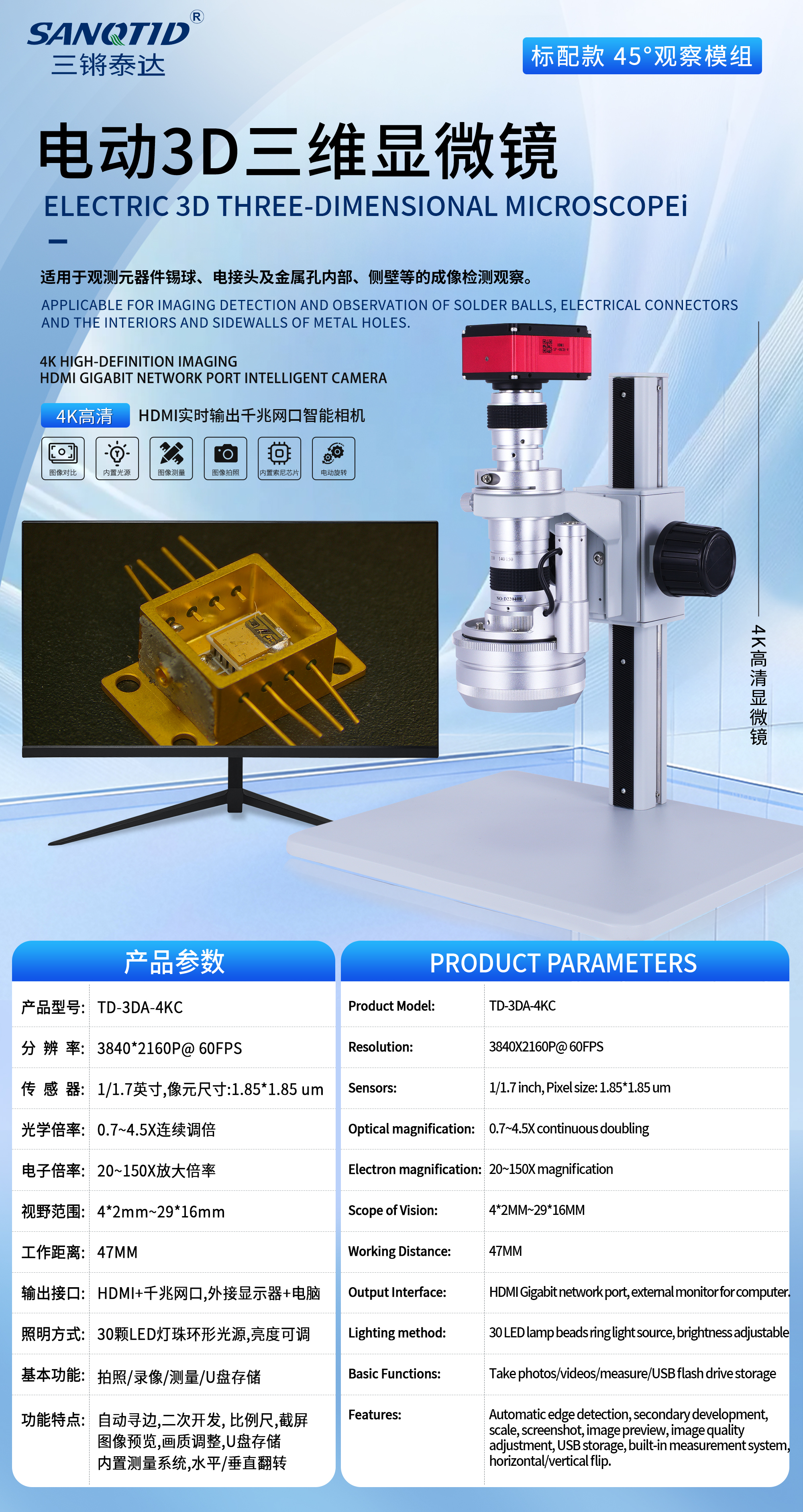 三鏘泰達-電動旋轉3D顯微鏡TD-3DA-4KC,支持自動尋邊,二次開發,比例尺,截屏圖像預覽,畫質調整,U盤存儲內置測量系統,水平/垂直翻轉。適用于觀測元器件錫球、電接頭及金屬孔內部、側壁等的成像檢測觀察。