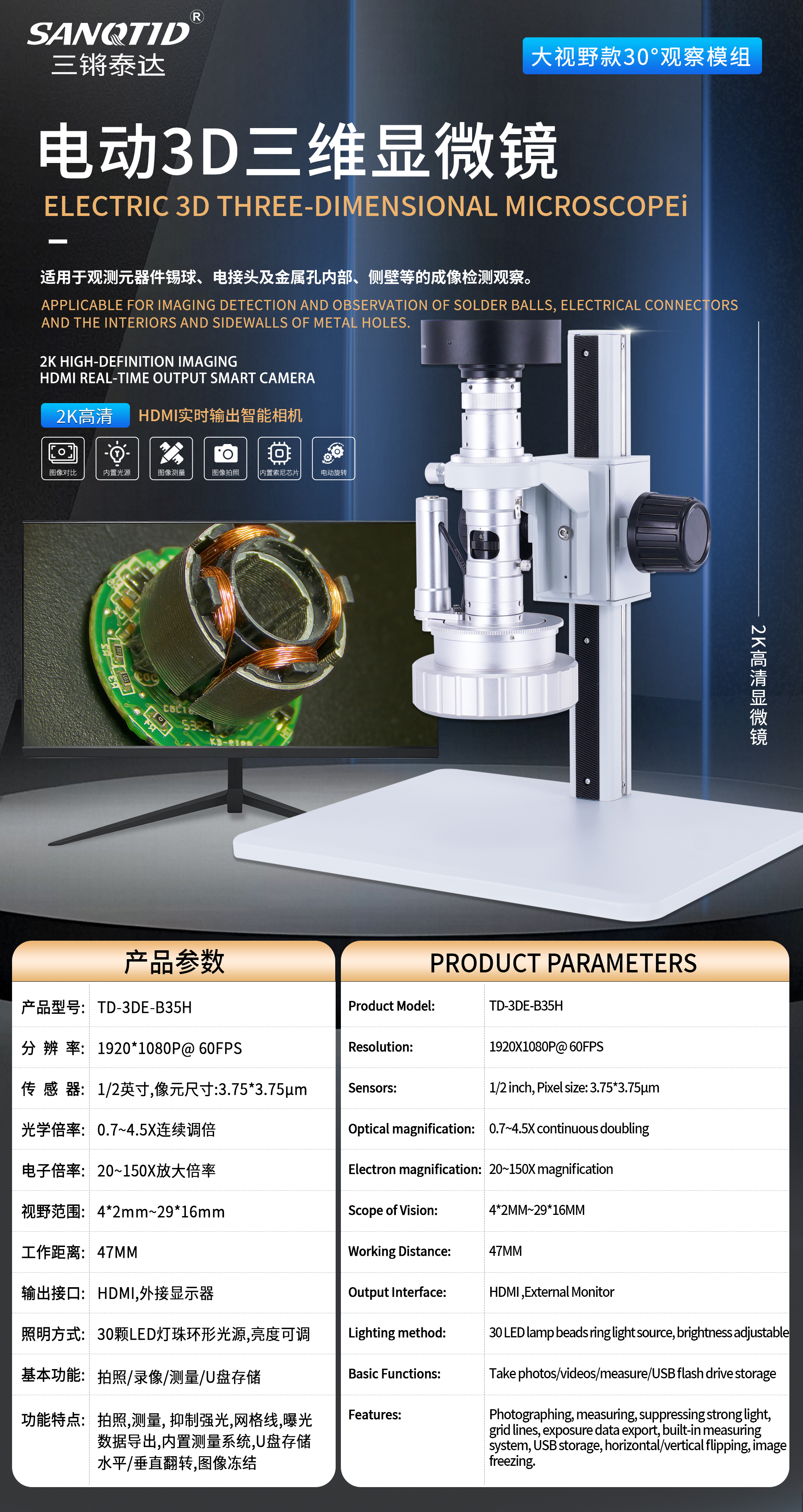 三鏘泰達-2K抑強光電動旋轉3D顯微鏡TD-3DE-B35H ,支持拍照,測量,抑制強光,網格線,曝光數據導出,內置測量系統,盤存儲水平/垂直翻轉,圖像凍結。適用于觀測元器件錫球、電接頭及金屬孔內部、側壁等的成像檢測觀察。