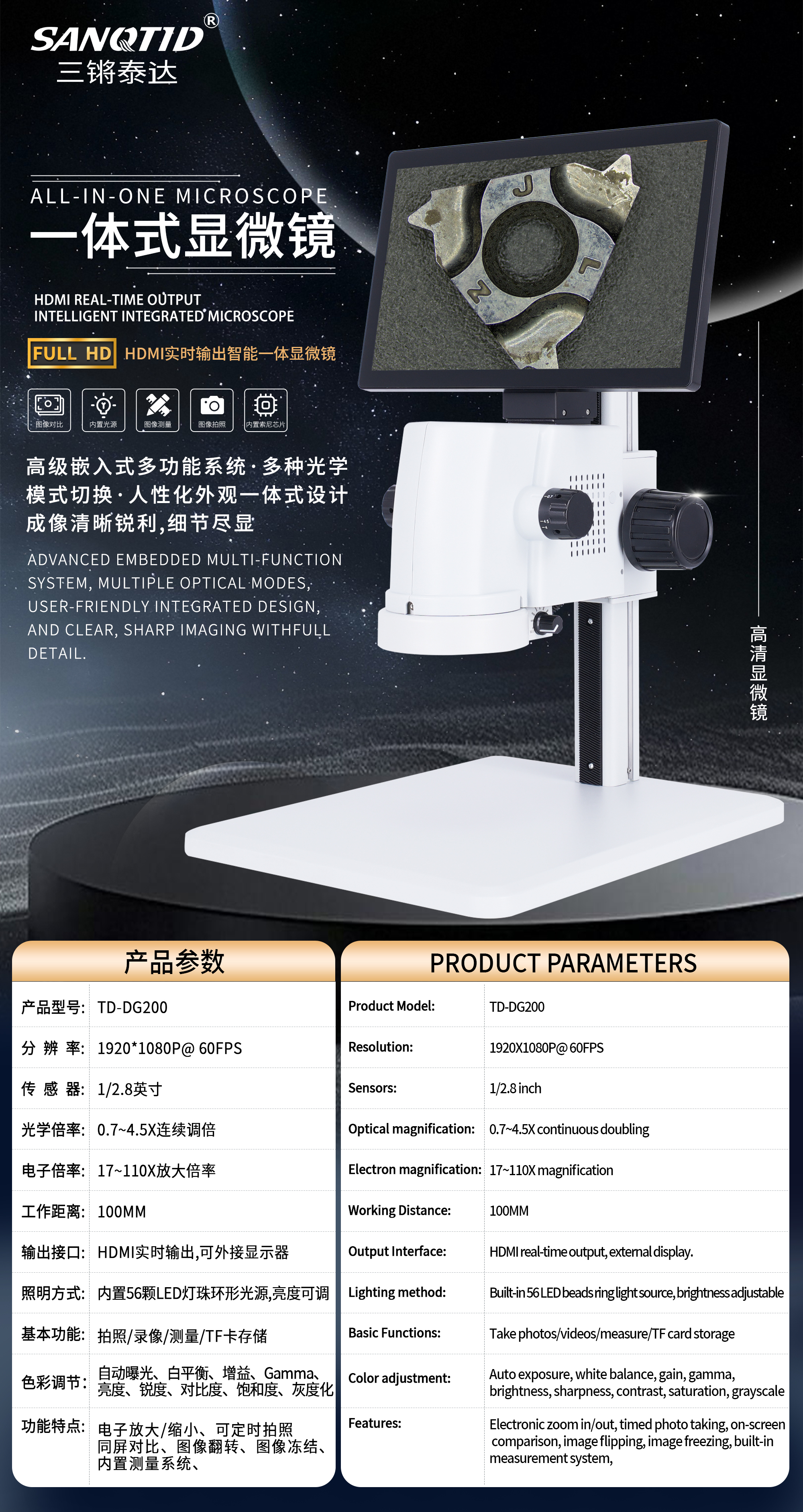 三鏘泰達 一體式顯微鏡TD-DG200,高級嵌入式多功能系統,多種光學模式切換,人性化外觀一體式設計成像清晰銳利,細節盡顯。