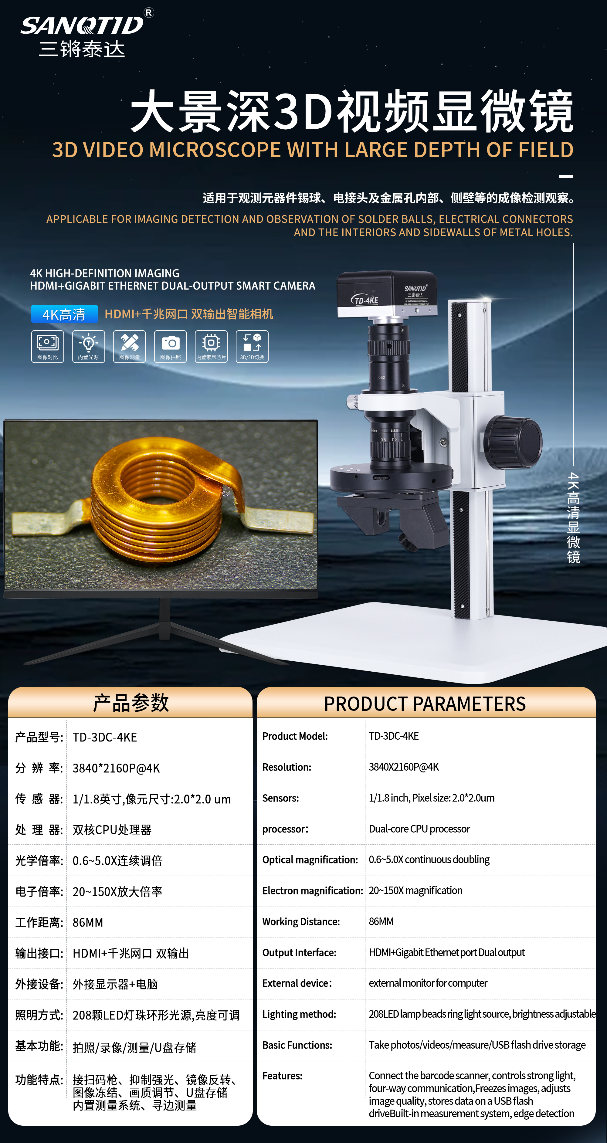 三鏘泰達(dá)-大景深3D視頻顯微鏡TD-3DC-4KE,適用于觀測元器件錫球、電接頭及金屬孔內(nèi)部、側(cè)壁等的成像檢測觀察。