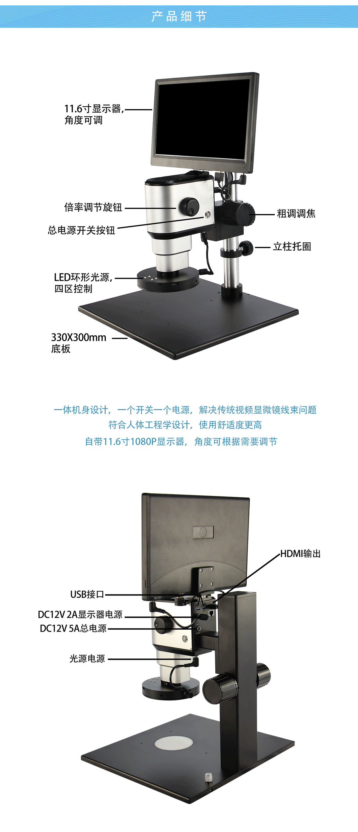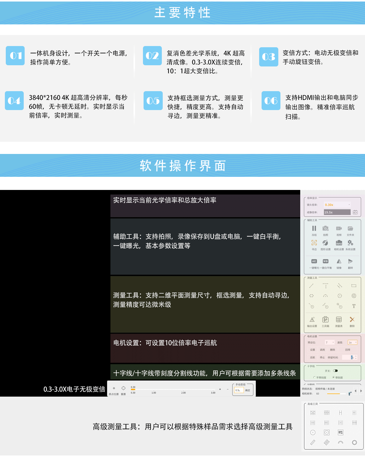 一體機(jī)身設(shè)計(jì),一個(gè)開(kāi)關(guān)一個(gè)電源,操作簡(jiǎn)單方便;0.3-3.0X連續(xù)變;變倍方式:電動(dòng)無(wú)極變倍和手動(dòng)旋鈕變倍; 3840*2160 4K 超高清分辨率,每秒60幀,無(wú)卡頓無(wú)延時(shí);實(shí)時(shí)顯示當(dāng)前倍率,實(shí)時(shí)測(cè)量;支持HDMI輸出和電腦同步輸出圖像。